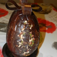 Création spéciale pour les gourmands de Pépieux : un œuf de Pâques moitié nougatine, moitié chocolat noir incrusté de fruits secs scintillés couleur bronze; le tout enrubané de chocolat (of course!)