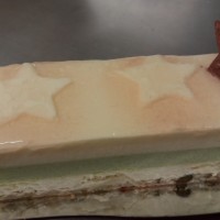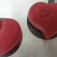 Création spéciale et audacieuse pour la Saint-Valentin! Un biscuit brownie aux pépites de chocolat et gingembre confit, une mousse au chocolat noir (pure origine Madagascar, d’où le « Afro »), un crémeux au chocolat et un confit gingembre-miel-amande; le tout recouvert d’un velours de chocolat au lait coloré rouge.